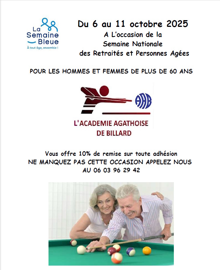 Dans le cadre de la semaine bleue du 6 au 11 octobre 2025 les nouvelles adhésions feront l'ojet d'une remise de 10% pour les personnes de plus de 60 ans.L'affiche jointe a été distribuée dans les résidences séniors et au CCAS Agde.